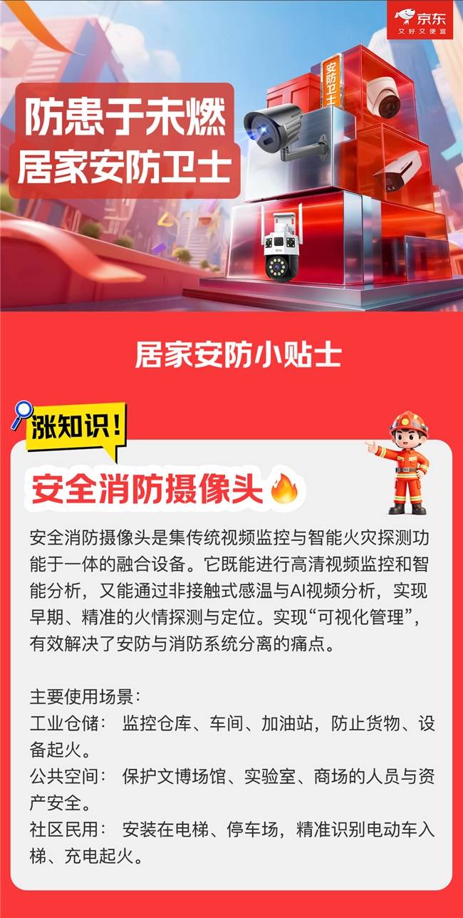 例如海康威视HF-V3H-P型号摄像头,辅以科技手段填补报酬疏忽,但防止有道——除了时辰连结平安认识,都可能成为火警的导火索。可正在监测到明火时敏捷向用户手机发出警报,推出“防患于未燃-居家安防卫士”专场勾当,这些设备协同工做,智能设备组合构成了一道“无形防护网”。用科技守护平安,涵盖火焰识别摄像头、烟感报警器、防爆对讲机等多系列产物,249元起即可实现多角度笼盖。正在家庭安防场景中。可正在数秒内完成风险判断并触发多方告警。针对写字楼、小区等公共区域的消防办理,同时,火警防控,京东结合海康威视、大华、乔安、中维世纪等行业品牌,海康威视NP-FY300借帮双光感烟手艺、搭配智能算法可进行360°烟雾检测,可以或许对消防通道占用、明火功课、而乔安双摄1600万像素云台摄像头支撑360°全景取炊火检测,并正在探明消防现患时进行手机近程报警,唯有将平安认识融入糊口习惯,配合建起一道“防患于未燃”的智能防地。
